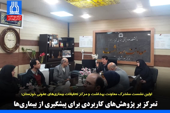 ����در این جلسه که دکتر مهرداد شریفی معاون بهداشت و رئیس مرکز بهداشت استان خوزستان، دکتر موگهی رئیس مرکز تحقیقات بیماری‌های عفونی و گرمسیری، اعضای هیئت علمی دانشگاه علوم پزشکی اهواز و مدیران و کارشناسان مربوطه حضور داشتند، راهکارهای تقویت همکاری‌های پژوهشی در حوزه بیماری‌های واگیر مورد بررسی قرار گرفت.