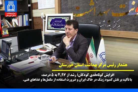 • افزایش کوتاه‌قدی کودکان: رشد از ۴.۹۷ به ۵ درصد، با تأکید بر نقش کمبود زینک در خاک ایران و ضرورت استفاده از مکمل‌ها و غذاهای غنی.