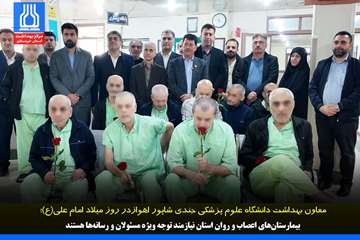 به گزارش روابط عمومی معاونت بهداشت دانشگاه علوم پزشکی جندی شاپور اهواز، دکتر مهرداد شریفی معاون بهداشت و رئیس مرکز بهداشت استان خوزستان همزمان با سالروز ولادت امام علی(ع) و روز مرد، از بیمارستان بوستان اهواز (مرکز نگهداری جانبازان و بیماران اعصاب و روان دوران دفاع مقدس) بازدید کرد.
