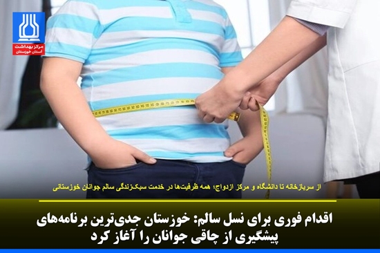 خوزستان جدی‌ترین اقدامات پیشگیرانه علیه چاقی جوانان را آغاز کرد! از الزام مشاوره تغذیه قبل از ازدواج تا نظارت بر بوفه‌های دانشگاهی، بازدید فصلی از شاخص‌های چاقی و حضور کارشناسان در سربازخانه‌ها و دانشگاه‌ها — همه برای یک نسل سالم و پویا.