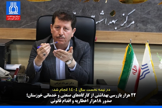 به گزارش به گزارش روابط عمومی معاونت بهداشت دانشگاه علوم پزشکی جندی شاپور اهواز، دکتر مهرداد شریفی معاون بهداشت و رئیس مرکز بهداشت استان خوزستان گفت: در نیمه اول سال جاری، ۱۲۲ کارشناس بازرس بهداشت حرفه‌ای با انجام ۲۲۸۷۴ مورد بازرسی از ۲۳۹۲۱ کارگاه فنی، خدماتی و صنعتی در ۲۴ شهرستان تحت پوشش، موفق به شناسایی و برخورد قانونی با هزاران تخلف بهداشتی و ایمنی شدند.