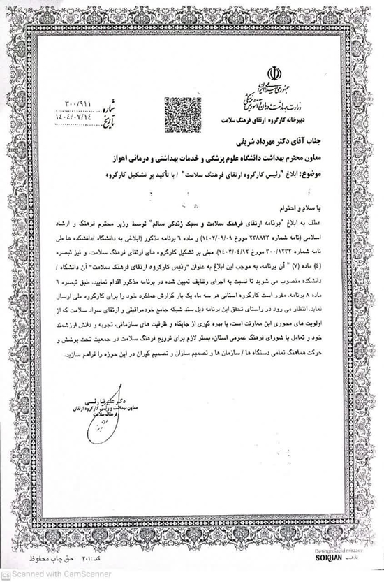 ابلاغ برنامه ارتقای فرهنگ سلامت و سبک زندگی سالم توسط وزیر محترم فرهنگ و ارشاد اسلامی مبنی بر تشکیل کارگروه‌های ارتقای فرهنگ سلامت است.