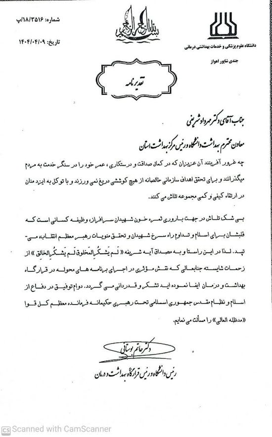قدردانی رئیس دانشگاه علوم پزشکی اهواز از تلاشها و ارزشآفرینی دکتر مهرداد شریفی در حوزه بهداشت استان خوزستان